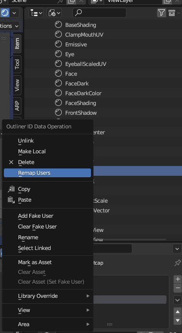 레퍼런스 모델에 업데이트된 머티리얼을 추가할 때 사본이 생기는 것 때문에 꽤 골치가 아팠는데, Remap기능을 사용하면 편하게 할 수 있다. 이처럼 요소를 Append하면 생기는 .001사본은