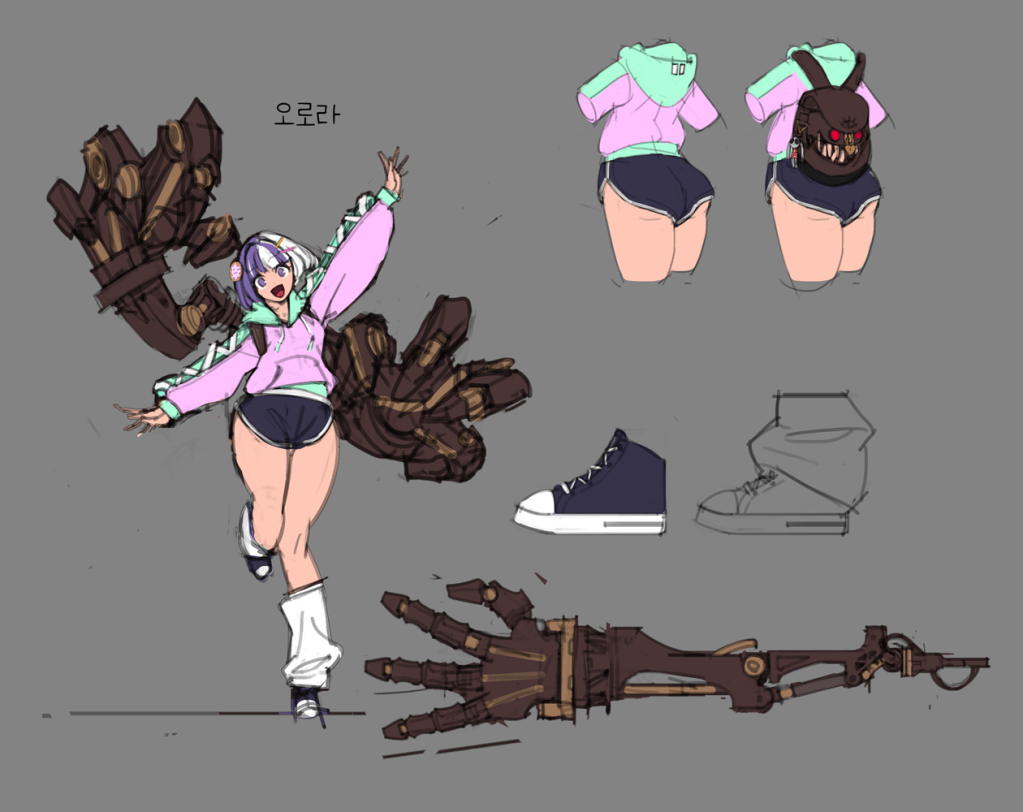 오로라의 컨셉은 조금 변했다. 원래 가방에서 나오는 것은 각종 총기 및 무기였고, 이에 따라 원거리 캐릭터로 구상했었으나, 잡기 캐릭터가 필요하다는 생각에 노선을 변경했다. 본체는 약하지만 뒷팔이 힘쎄고 강하니까! 하지만 뜻밖에 가방의 이미지가 너무 안잡혀서 몇 번을 갈아엎었는지 모른다.