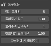 첫프레임 보간비율을 추가. 어쩐지 여기 항목 점점 늘어난다(…) 이 값은 키를 물려줬을 때, 키를 미는 과정에서 0프레임에 키가 비는 현상을 보간해준다.
