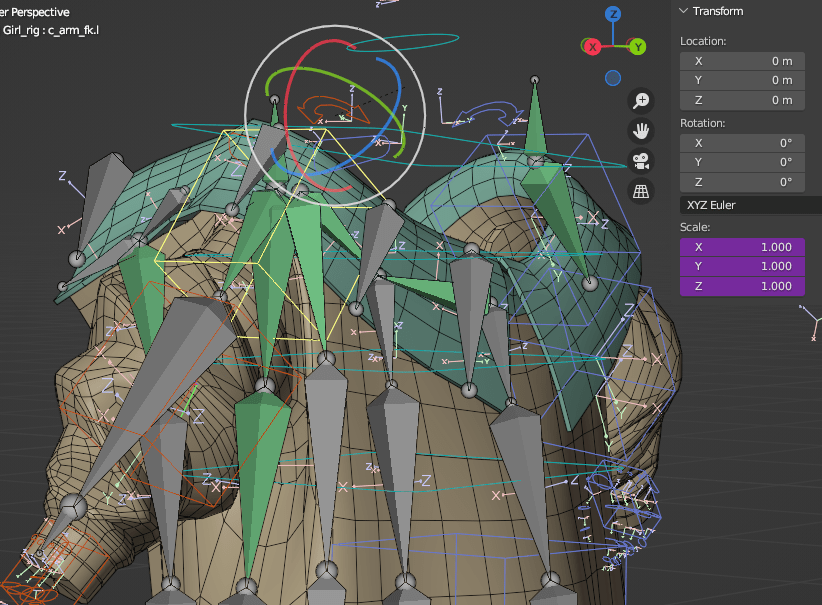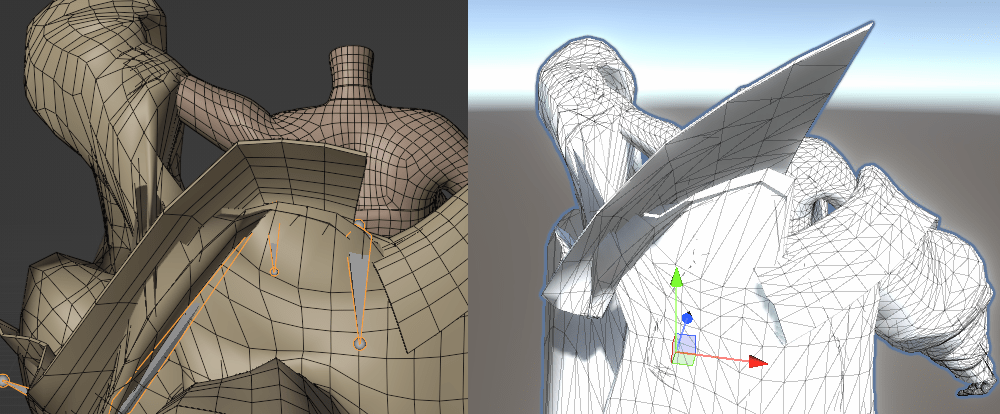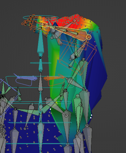 팔의 메쉬가 튀는 원인은 알아냈다. 문제가 되는 버텍스들이 서로 다른 본에 반씩 걸쳐있는 것이 문제였다. 보통이라면 이것들이 크게 문제가 되진 않지만 회전제약을 걸어놓은 상태라 문제가 된다….라지만 그래도 문제가 되면 안될텐데?
