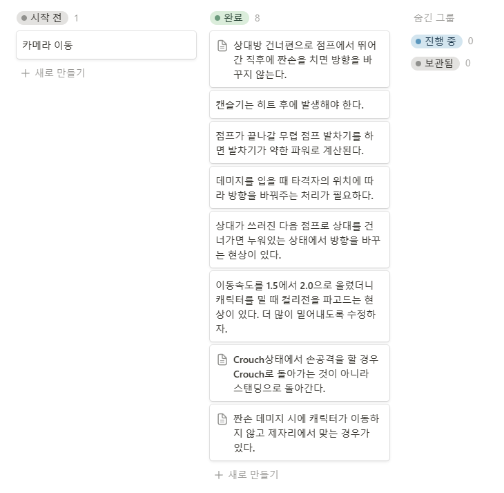 상태머신 보강 2024년 1월 17일2024년 1월 17일배틀퀸(BattleQueen)에 게시됨 1.17 애니메이션을 제작하며 발견되는 버그를 그 때 그 때 노션에 적어두고 있다. 작업을 변경하는 건 정신적으로 꽤 큰 피로감이 있기 때문에 이렇게 몰아서 하는 편이다. …는 생각보다 일찍 끝났네?! 카메라는 어차피 배경들어간 후에 작업해야 하고… 이제 캔슬기는 히트시에만 사용할 수 있다. 짠손은 강손으로, 강손은 스킬로, 스킬은 초필로 캔슬할 수 있다. 다음은 닐리의 기본 애니메이션을 만들어 보자. 좋아하기 가져오는 중... 관련