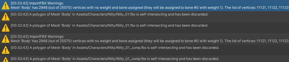 데이터가 복잡하기 때문에 임포트는 한 번에 안된다. 처음 데이터를 임포트하면 수많은 에러가 뜬다. 무려 2948개의 버텍스가 부모본을 못찾고 있다. ARP의 커스텀 본 세팅을 빠뜨린 모양이다.