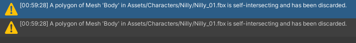 원인을 조사해보니 4각이 넘어가는 폴리곤이 있을 경우 이런 경고문을 띄운다고 한다. 하지만 앨리스를 작업할 때엔 보지 못한 경고문이다. 아마도 닐리의 악세사리에서 사용한 평면적인 베벨이 문제를 일으키는 것이 아닐까 싶다. 엔진이 보기엔 ‘이런 거에 폴리곤 낭비하지마!’같은 느낌이겠지. 하지만 난 그게 필요하단다. 일단 4각이하로 폴리곤을 정리해주기로 하자.