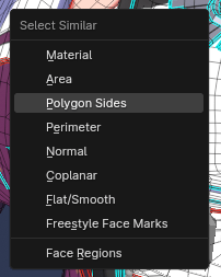 블렌더에선 Select Silmilar(shift+G)로 선택한 폴리곤과 같은 각의 폴리곤들을 모두 선택할 수 있다.