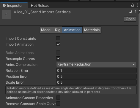 이에 대해 프로젝트에 블렌더를 사용하고 있는 지인과 이야기를 했었는데, 키프레임 압축률에 의해 애니메이션이 깨지고 있다는 결론을 얻었다! 처음엔 ARP의 익스포트 문제일거라 생각했는데 내보낸 FBX를 블렌더로 임포트해본 결과, 데이터는 아무런 문제가 없었다. 이럴 수가! 유니티의 최적화 문제였다니.