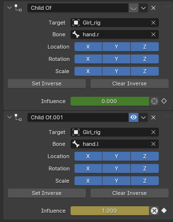 문제 2번. 잡기를 한 캐릭터를 반대편으로 던져보낼 경우 캐릭터가 반전된다. 이 경우 무기를 쥔 손이 반전되기 때문에 임시로 차일드를 왼손에서 오른손으로 변경해줄 필요가 있다. 제약 조건 중에 Child Of를 양손에 걸고 Influence에 키를 주면 될 것이다. 그런데 이것이… 안된다. 차일드 오브가 2개 이상될 경우 프레임 지연현상이 일어난다.