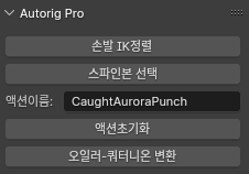 ARP에도 회전값 변환기가 들어있기는 한데, 사용이 불편해서 새로 만들었다. Euler모드를 맞춰놓고 돌려야 제대로 작동하는 걸로 보아 비주얼키를 베이킹하는 모양이다. 게다가 액션그룹 지정도 안해줘서 목록이 밖으로 빠져나간다… 여러모로 언젠가는 해야 할 작업이었다.