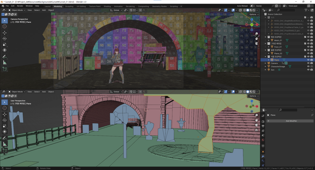 바닥의 경우 2cm정도의 높낮이를 주었지만, 이것이 생각보다 더 캐릭터를 떠 보이게 하는 결과가 있었다. 무조건 평면이 낫드라.