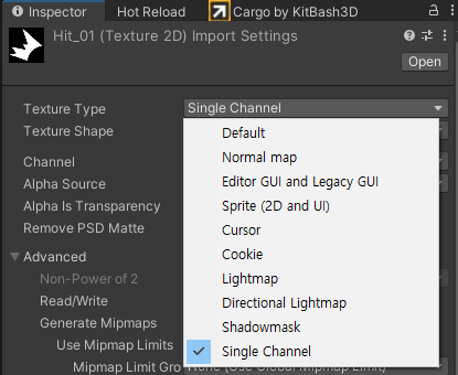 이펙트의 마스크 이미지는 싱글채널을 사용한다. R과 A중 고를 수가 있다. 기본값이 A인걸로 보아 A를 추천하는 모양인데, 셰이더에서 정보를 받을 때 4채널로 받은 후 1개만 쓰는 구조가 마음에 들지 않았다. 그래서 지금까지는 번거로워도 R채널을 쓰고 있었는데… 샘플링하면 무조건 4채널로 받는 모양이다. (에러가 나는 건 아니지만, 경고가 뜬다.) 이래나 저래나 똑같다면 그냥 A를 쓰는 게 낫겠지만…