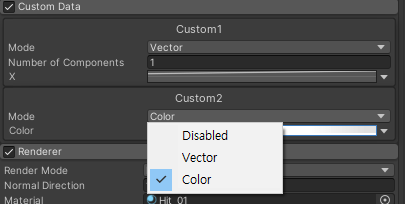 파티클의 커스텀 데이터를 다룰 때 사용하는 모드는 ‘보기‘이다! 컬러 시맨틱을 커스텀 데이터로 사용한다는 뜻이 아니다! 이걸 사용하려면 커스텀 데이터를 TEXCOORD1에 할당해서 사용하여야 한다.