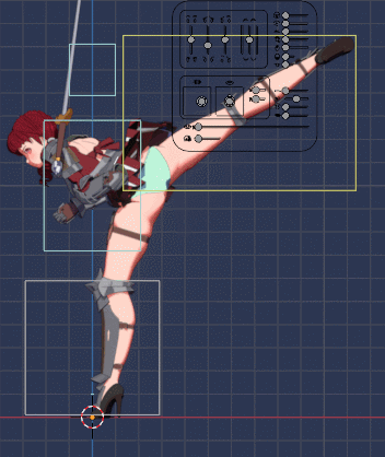 다음은 충돌 박스를 맞추는 일이다. 지금까지는 충돌박스가 움직이지 않았다.(그런데 놀랍게도 크게 어색하지 않다.) 하늘색박스는 바디, 노란색 박스는 어택박스다. 바디는 머리/몸통/다리로 나뉘어지고, 다리는 점프 시에 충돌체크를 하지 않는다. 이렇게 되면 머리는 사실상 별로 쓸 일이 없는데, 캡콤이 그렇게 해서 무지성으로 따라했다(…) 사실 등빨이 넓은 캐릭터라면 이게 의미가 있을 것 같은데 여캐밖에 없다 보니 이게 그렇게 쓸모가 있을 것 같지는 않지만… 뭔가 이유가 있겠지.