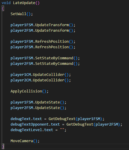 지금까지는 Update()의 순서가 뒤죽박죽이었다. 이를 게임매니저에 몰아준다. 컬라이더를 시스템에서 생성하도록 바꾸고, 발사체등의 외부요인이 캐릭터의 스테이트를 바꿀 수 있으니 LateUpdate에서 최종적으로 처리해준다. 깔끔하다! 이렇게 되면 최종 판정은 현재 기준으로 발사체-커맨드-잡기-데미지 순으로 처리된다. 잡기에 성공해도 타격이 들어왔으면 맞는다. 물론 이를 바꿀 수도 있다. 판정이 항상 애매했는데, 정리하니 한결 나은 느낌이다.