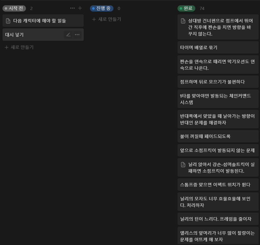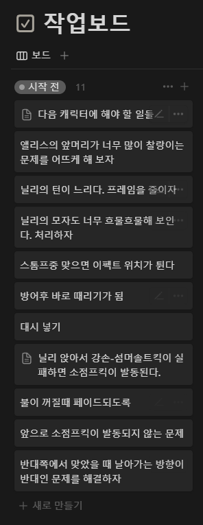 야호. 다 했다. 대시는 추후 작업이다. 며칠 전에 지인사무실에서 간이테스트를 했던 적이 있었는데, 가장 개선되었면 좋을 것 같은 요소였다. 21세기 유저가 플레이하기엔 아무래도 답답한 모양. 그래서 추가하기로 결정했다.