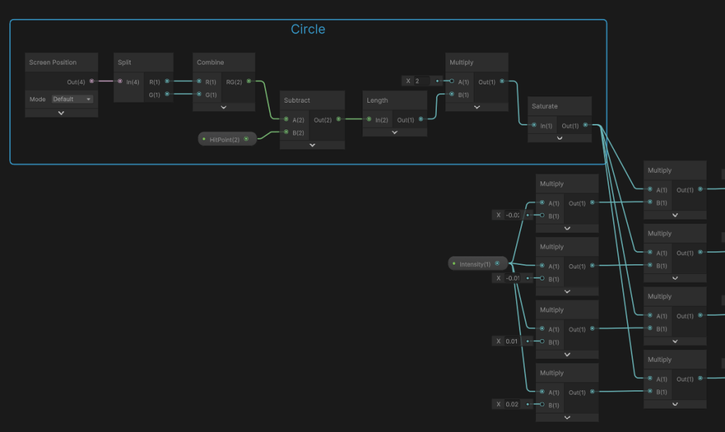 줌은 히트영역이 중심이다. 따라서 가운데 부분은 줌이 약하다. 약한 김에 좀 더 약하면 안될까?length를 이용해 원을 만들고, 이를 적용치에 곱해주어 가운데 부분엔 왜곡이 덜하도록 수정해 준다.