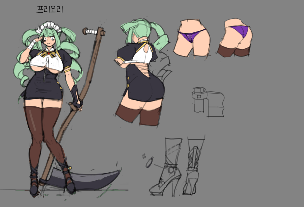 1. 천천히 시간을 가지세요! 낫은 굉장히 멋있어 보이는 공격을 할 수 있는 무기인데, 메이드이기 때문에 전사처럼 무기로 사용하기보다는 도구로 사용하는 것이 합리적이라고 생각합니다. 그리고 왠지 그녀의 애니메이션 중 하나가 오로라 같은 포옹이 될 것이라고 상상하지만, 폭탄을 주는 대신 그녀는 상대를 가슴으로 질식시킵니다… 장황하게 말해서 죄송합니다. 캐릭터 디자인이 너무 마음에 들고, 어떻게 움직일지 상상하는 것도 재미있습니다.