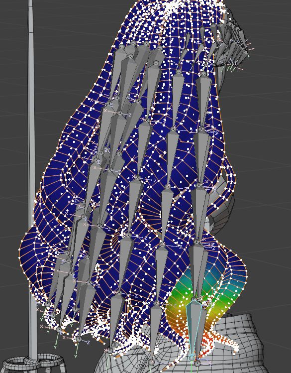 어깨의 숄은 모델링을 할 때부터 고민이긴 했다. 본 설계를 어떻게 해야 하지? 팔에 의해 형태가 변해야 하지만 팔과 완전히 동일하게 움직일 수는 없다. 약간이긴 하지만 움직임에 이격이 필요하다. 그리고 그것과 별개로 스샷처럼 옷감의 말단을 본의 말단에 맞춰놓으면 움직임이 부드럽지 않다. 전에도 2번째 캐릭터인 닐리가 그렇게 고생을 시키더니, 벨도 그런 조짐이 보인다. 일단 자고 일어나서 … 생각해 보자.
