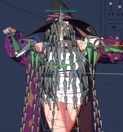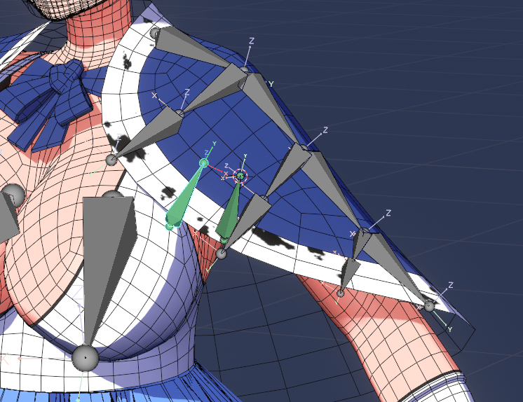완전히 예쁘지는 않지만, 그럭저럭 잘 움직인다. 팔에 가장 가까운 본이 팔의 움직임을 카피하고 나머지 본들은 비율을 줄여가며 쫓아간다. 여기에 다이나믹 본의 움직임을 더하면 팔랑팔랑 잘 움직일 것으로 기대한다.