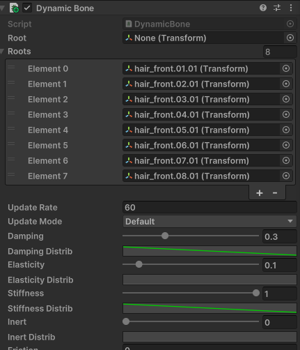 다이나믹본의 Inert는 물리 계산 기준 좌표계의 월드:로컬 비율인 것 같다. 1로 갈수록 로컬비율이 커진다. 이 값은 지금까진 뭔지 몰라 신경쓰지 않고 있었는데, 캐릭터의 움직임이 빠를 경우 지나치게 본이 깨지는 현상을 막아준다.