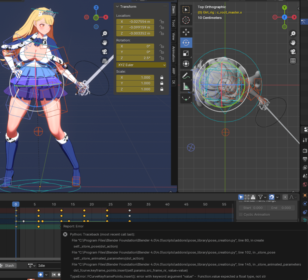 벨의 대기자세를 등록하려는데 문제가 발생했다. 오류메세지는 많은 정보를 주는 것 같지만 실제로는 큰 도움이 안된다. 원인을 추적해보니 상체의 회전방식 변경 키가 오류를 일으키고 있었다. Euler회전은 사용자가 축별 제어를 하기는 편하지만 짐벌락이 발생하고, Quaternion은 짐벌락은 없지만 축별 제어가 불가능하다. 둘 다 장단점이 있다. 때문에 혼용을 하기 위해 회전방식 변경에도 키를 넣어두는데, 이것이 오류를 일으키는 것이다. 블렌더의 버그인데, 일단 포즈어셋을 만들면 그 안에서는 또 회전키가 잘만 생성된다. 때문에 일단은 키가 없는 상태로 포즈어셋을 만들고 해당 포즈의 편집모드에서 회전키 변경 관련키를 넣어주어야 한다. 조금 번거롭다. 버전업되며 수정되었을까?