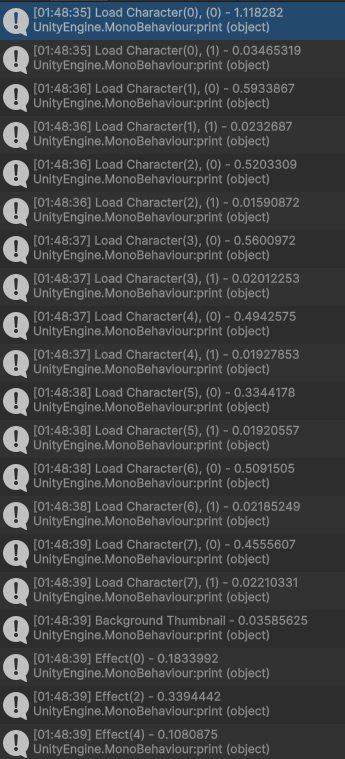 선택화면에서 3D캐릭터를 보여주기 위해서는 미리 로딩을 해놓아야 한다. 최고 13캐릭터가 한 번에 메모리에 올라가야 하는데, 테스트해본 바로는 캐릭터 하나에 약 0.5초의 로딩시간이 필요하다. 하지만 같은 캐릭터를 로딩할 경우엔 거의 시간이 소모되지 않는다. 텍스처를 줄이면 좀 나을까? 흐음… 다음에 테스트해보자.
