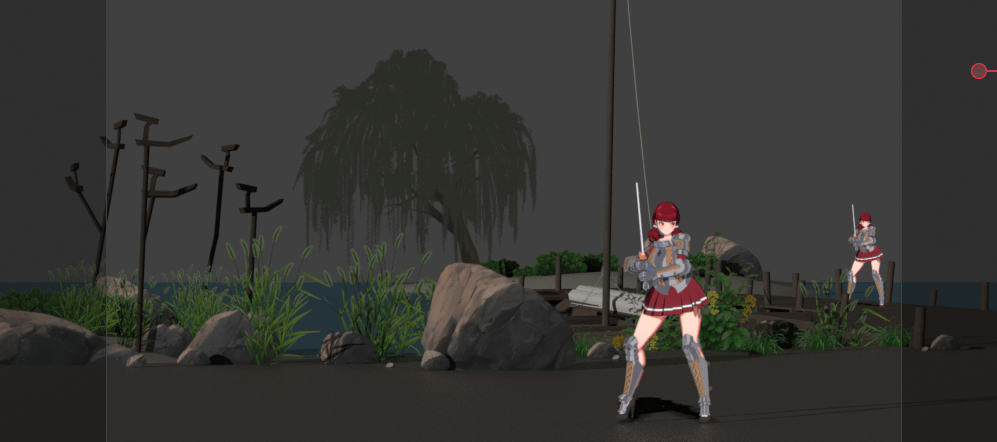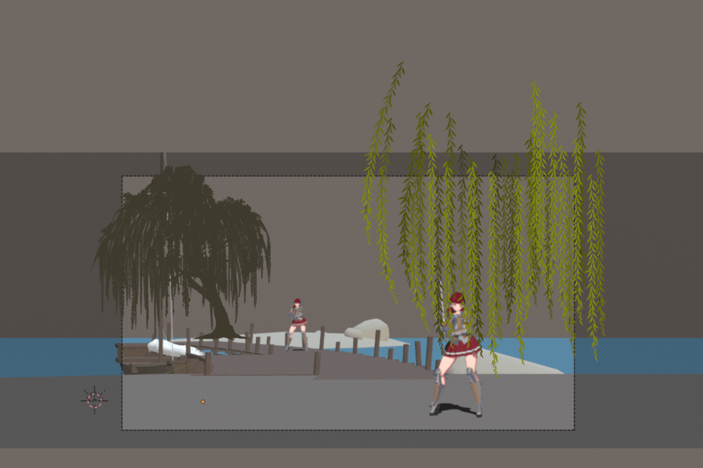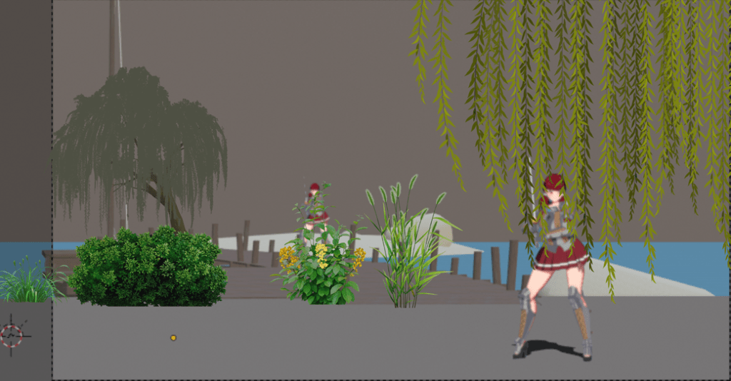 톤을 맞춘 모습. 왼쪽 2개는 Plant셰이더, 오른쪽의 2개와 버드나무는 일반 cutout으로 묶은 후 본 애니메이션을 할 것이다.