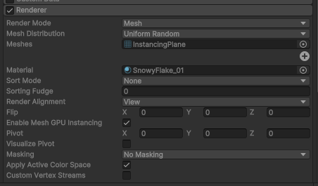 오늘의 깨달음. 빌보드는 인스턴싱이 되지 않는다?! 코파일럿의 이야기이기 때문에 완전히 신용할 수는 없지만, 카메라를 향하는 것 자체가 행렬재계산 과정이 들어가기 때문에 인스턴싱이 불가능할 것 같기는 하다. 따라서 인스턴싱을 하려면 Mesh를 사용해야 한다. 눈 같은 경우 굳이 카메라를 따라가지 않아도 되기 때문에 이 경우엔 Plane메쉬를 임포트해서 사용할 수 있다.