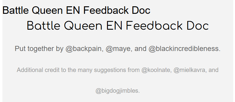 배틀퀸 디스코드의 외국팬분들께서 테스트 후에 적어주신 피드백 문서입니다. 단순한 불편사항들이 아니고 그에 대한 해결책까지 제안해주셨네요. 와. 정말 대단해요. 전 게임개발을 하면서 많은 QA를 진행해보진 않았지만, 이 문서는 제가 받은 피드백 중 가장 훌륭한 것입니다.