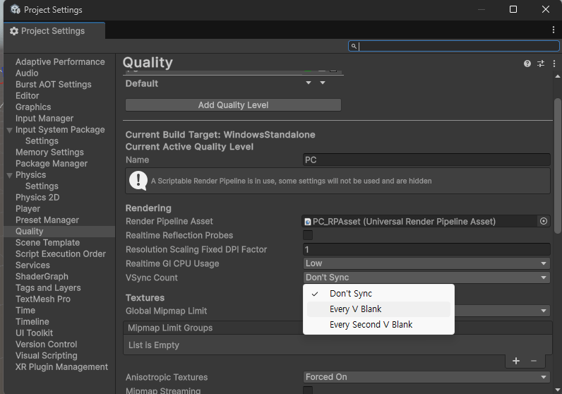 먼저 프레임레이트는 모니터의 주사율에 따라 달라진다. 주사율이란 화면이 1초에 얼마나 갱신되느냐를 나타내는 단위인데, 흔히 사용하는 60MHz의 모니터는 60번 갱신되는 것이다. 모니터에서 화면갱신이 일어나지 않는다면, GPU에서 화면을 새로그려도 의미가 없기 때문에 유니티에서는 프레임레이트를 주사율에 맞추는 처리를 기본으로 한다. 이것이 VSync이다.