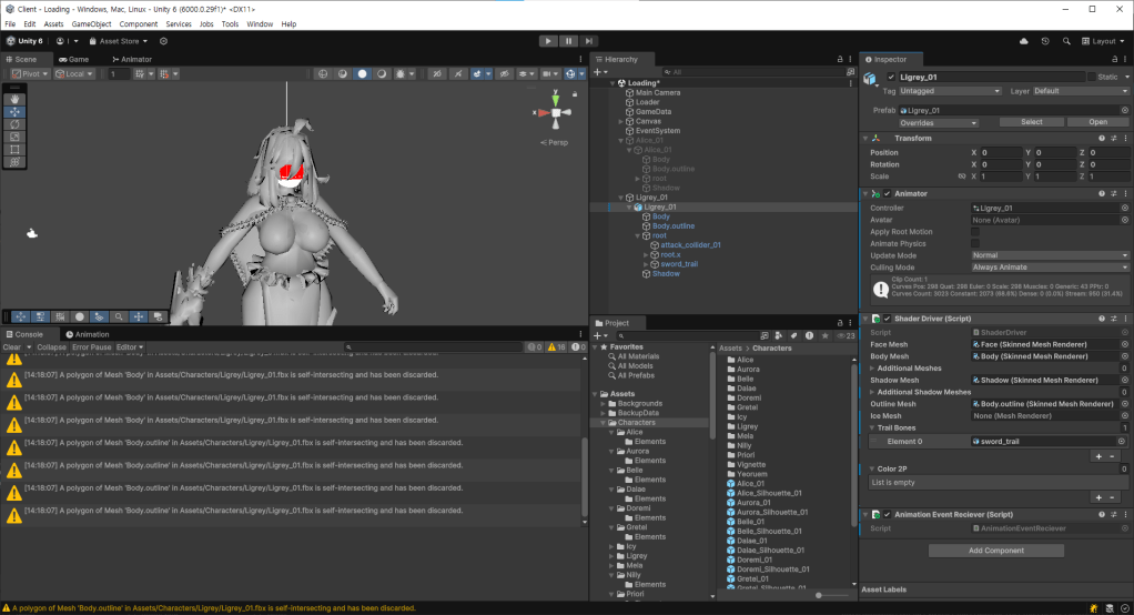 캐릭터를 처음 등록하려면 할 일이 많다. 각종 컴포넌트를 설치하고, 머티리얼을 만들고, 다이나믹 본을 설정하고, 스크립트에 등록하고… 캐릭터가 좀 더 많았다면 자동화했을테지만, 그리 많지 않아 굳이 그럴 필요는 없었다. 대부분의 시간은 다이나믹 본 세팅에 소요된다.