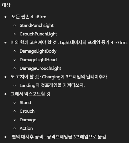 가장 먼저 바꿔야 하는 일은 모든 모션에 딜레이를 주는 일이다. 한국내에서의 전송이라면 현재의 짠손 동기화가 그럭저럭 돌아가는데 문제는 거리가 멀어질수록 이것이 힘들어진다는 점이다. 돌아는 가는데 뭔가 어색해진다. 때문에 짠손의 프레임을 좀 늘려준다. 더불어 바로 타격이 일어나는 동작들도 앞부분에 딜레이를 주어야 한다. 최소 3프레임은 보장하고 싶다. 시간으로 따지면 0.1초의 딜레이. 육안으로 쫓을 수는 없는데 약하게 체감은 된다. 하지만 게임에 방해될 정도는 아니고 이로서 안정감을 높일 수 있다면 그 쪽이 좋을 것 같다.