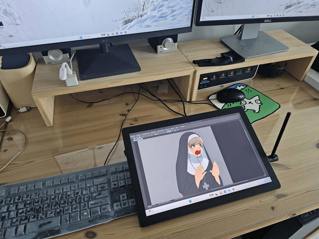 저번 주에 주문한 신티크가 도착했다! 설치하느라 몇 번의 삽질을 거친 후 성공적으로 안착. 그 동안 손으로 그리는 것과 타블렛으로 그리는 것이 왜 차이가 있을까 고민하다가 지인에게 신티크를 얻어써본 후 바로 구입을 확정했다. 그동안은 그게 뭐 얼마나 차이가 나겠어? 싶어 굳이 구입하진 않았는데, 실제로 써보니 확실히 차이가 난다.